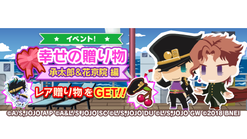 ジョジョのピタパタポップ 新イベント開催 イベントカード 幸せの贈り物 承太郎 アン編 が追加されました クリアすると 承太郎 アン と 偽キャプテン テニール が特に喜ぶ特別な贈り物を報酬として入手できます 開催期間 年12月10日